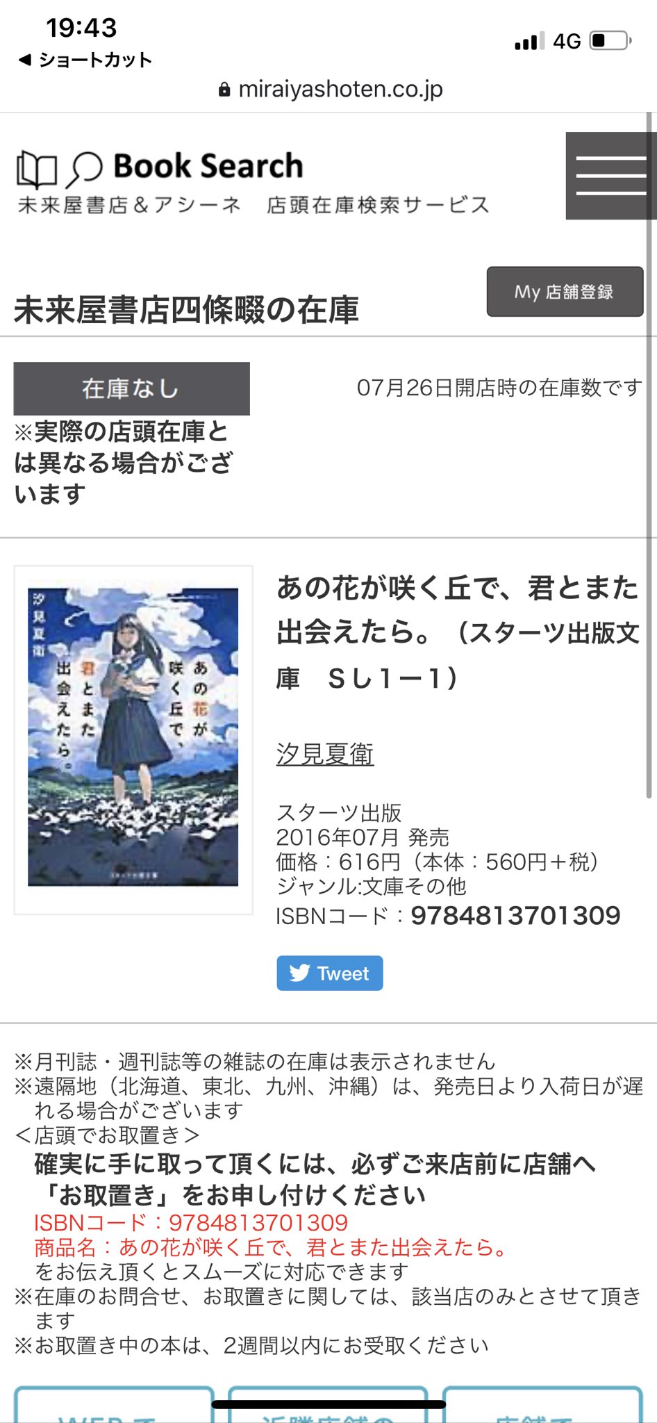未来屋書店 四條畷店 على تويتر 諸事情で在庫なしになっておりますが あの花が咲く丘で 君とまた出会えた は現在在庫ございます
